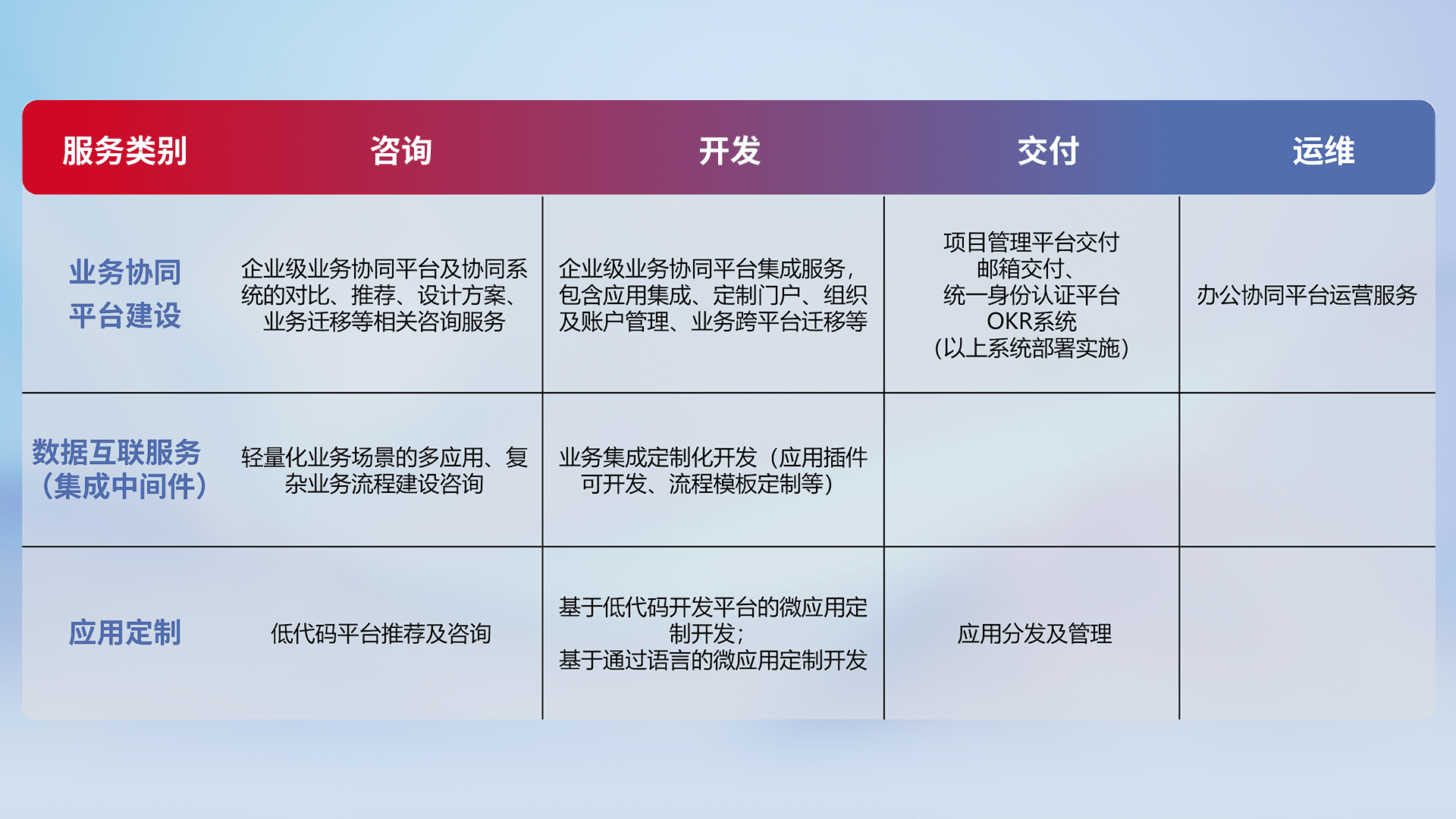 针对钉钉、、企微、、IDaas等平台级产品提供产品的规划、、方案、、、交付、、、、定制化开发等服务,,实现如统一协同办公、、智能客户服务、、混合会议管理、、智能数据查询、、、、等业务场景,,,实现数字化转型。。。。
