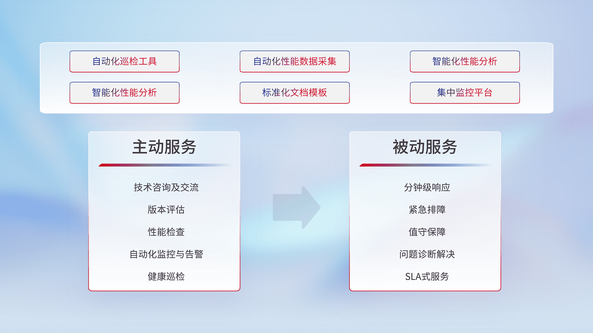 智能化工具和标准化文档,,,保障服务质量,,,提供主动服务(包含技术咨询、、、、版本评估、、、性能检查、、、、自动化监控与告警、、、、健康巡检)和被动服务包含(分钟级响应、、、、紧急排障、、、值守保障、、、、问题诊断解决、、SLA服务)。。。